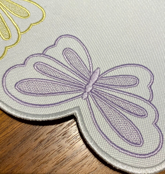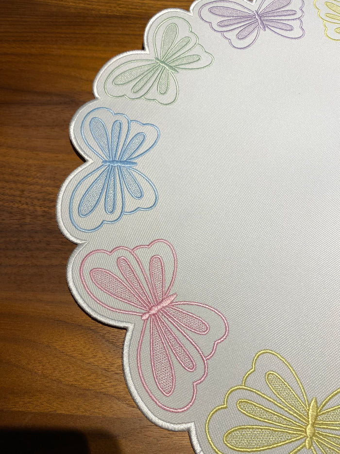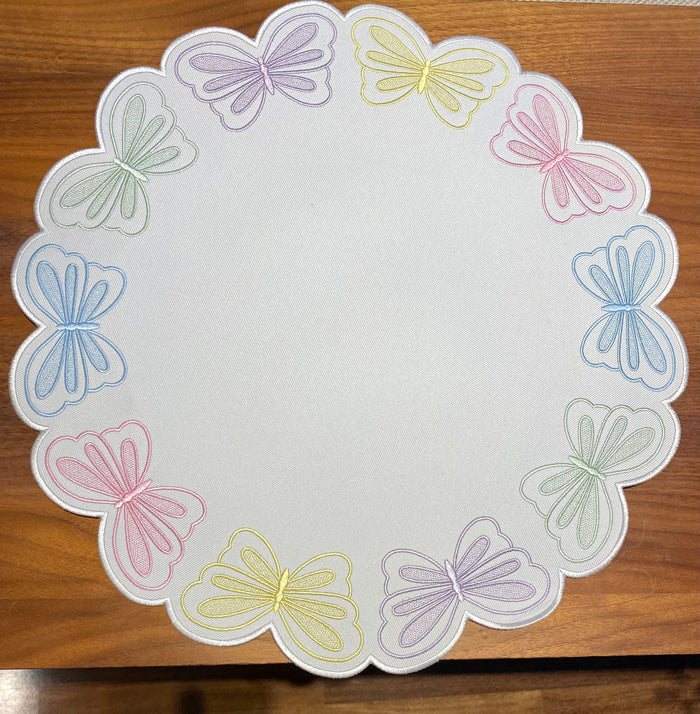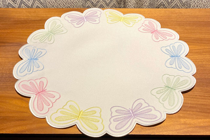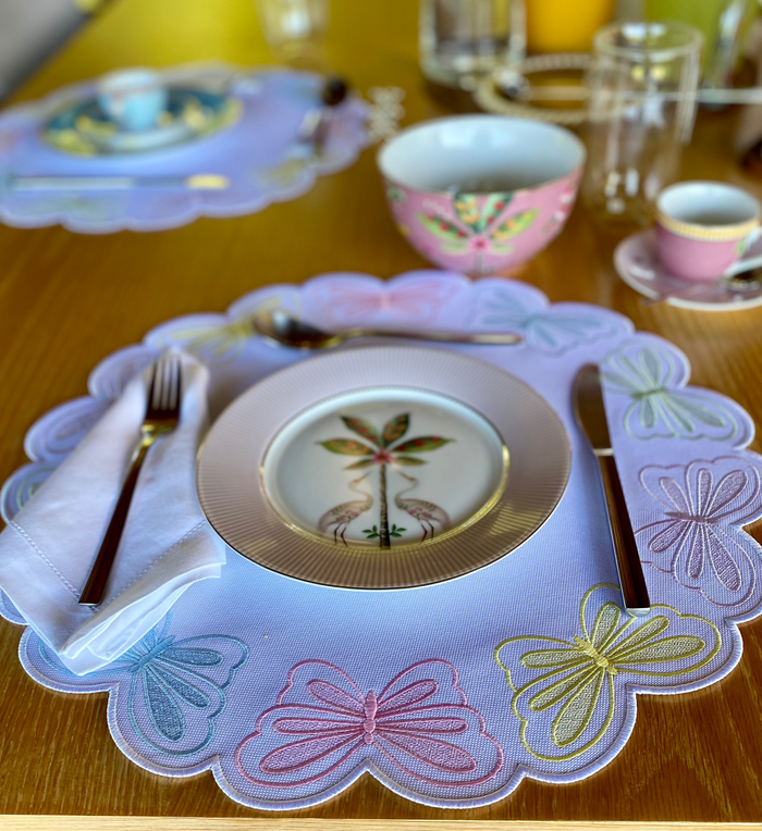 Jogo americano que encanta pela beleza e delicadeza dos bordados. Com lindas borboletas bordadas em 5 tons pastéis, combina com qualquer cor de louça.