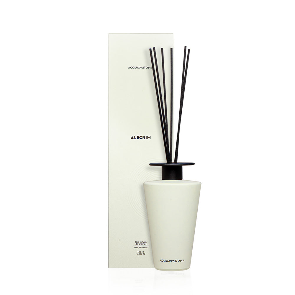 O difusor, com varetas de algodão preto, exala a fragrância intensa e fresca de Alecrim, conhecida por suas propriedades energizantes, despertando os sentidos e combatendo a fadiga mental.