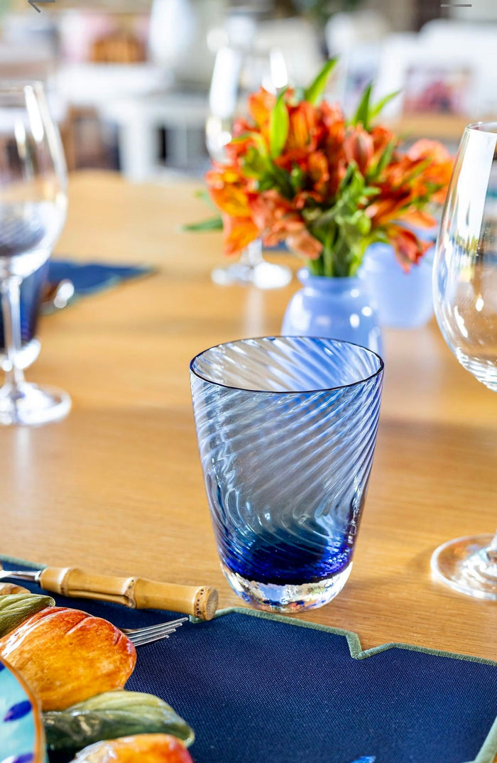 Fabricado com vidro de alta qualidade, este conjunto de copos oferece durabilidade e uma aparência refinada. O design ondulado, a transparência e a cor azul intenso, enfeitam e complementam qualquer decoração de mesa.