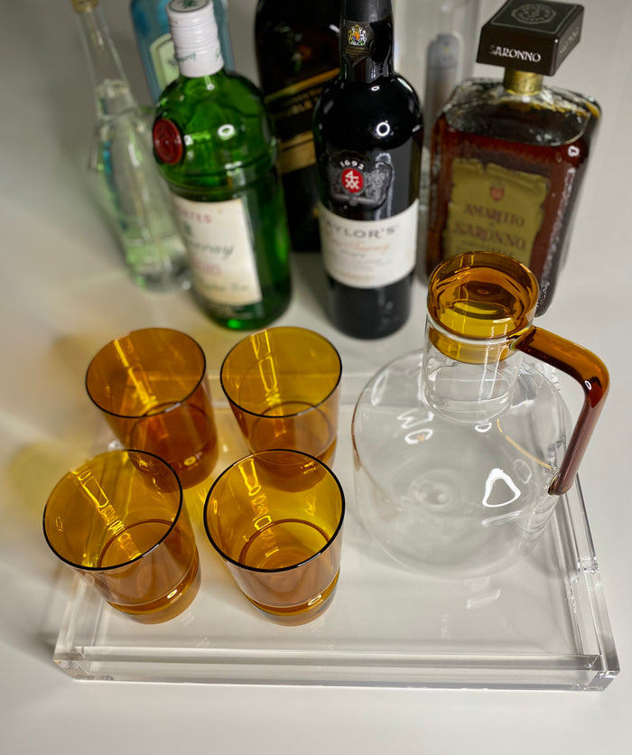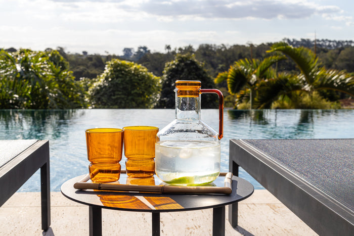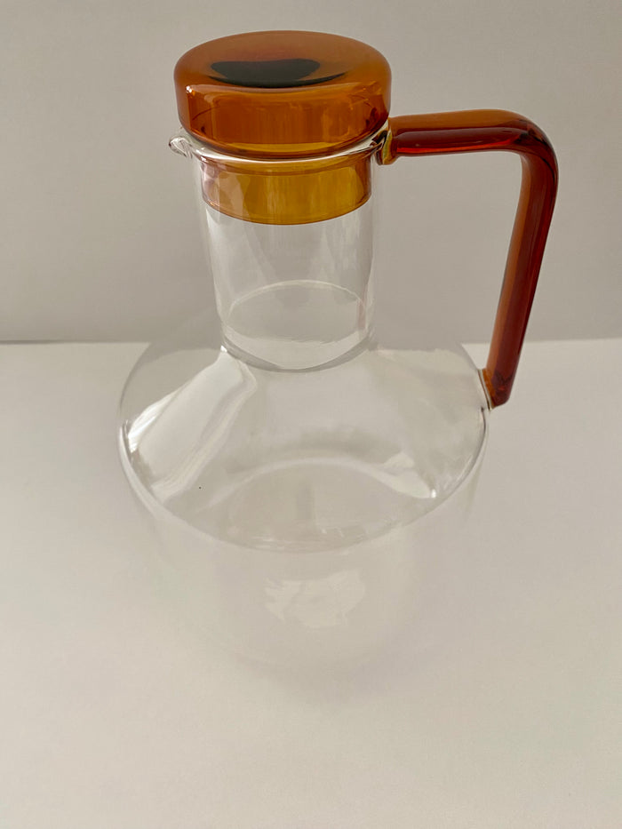 Com estética refinada a jarra Oslo é objeto funcional e decorativo. Fabricada com vidro borossilicato de alta qualidade é perfeita para servir sua bebida favorita ou para decorar uma bandeja de bebidas ou bar. A tampa e a alça na cor âmbar, contrastando com a leveza transparente do corpo, garantem ainda mais estilo à peça.
