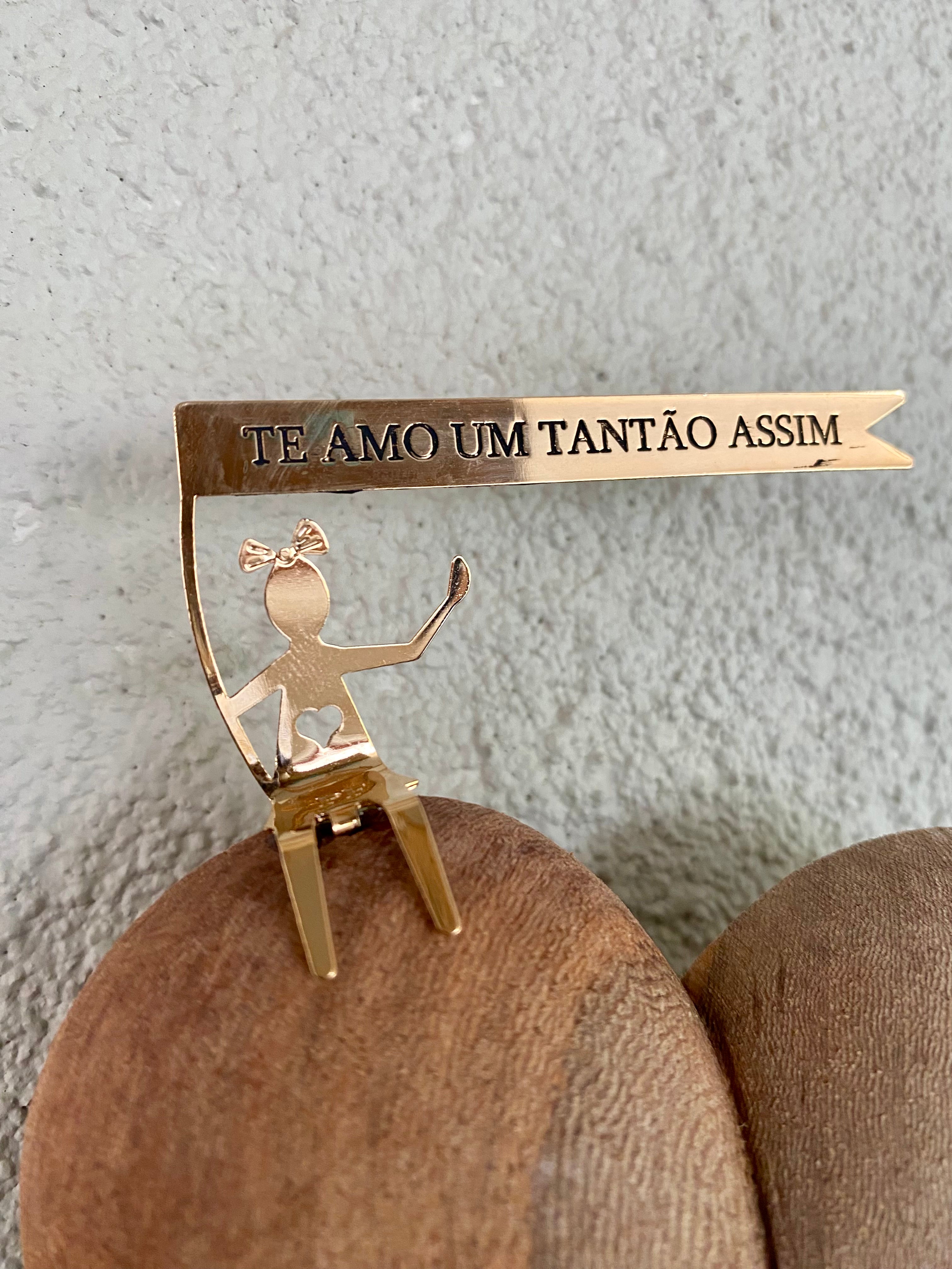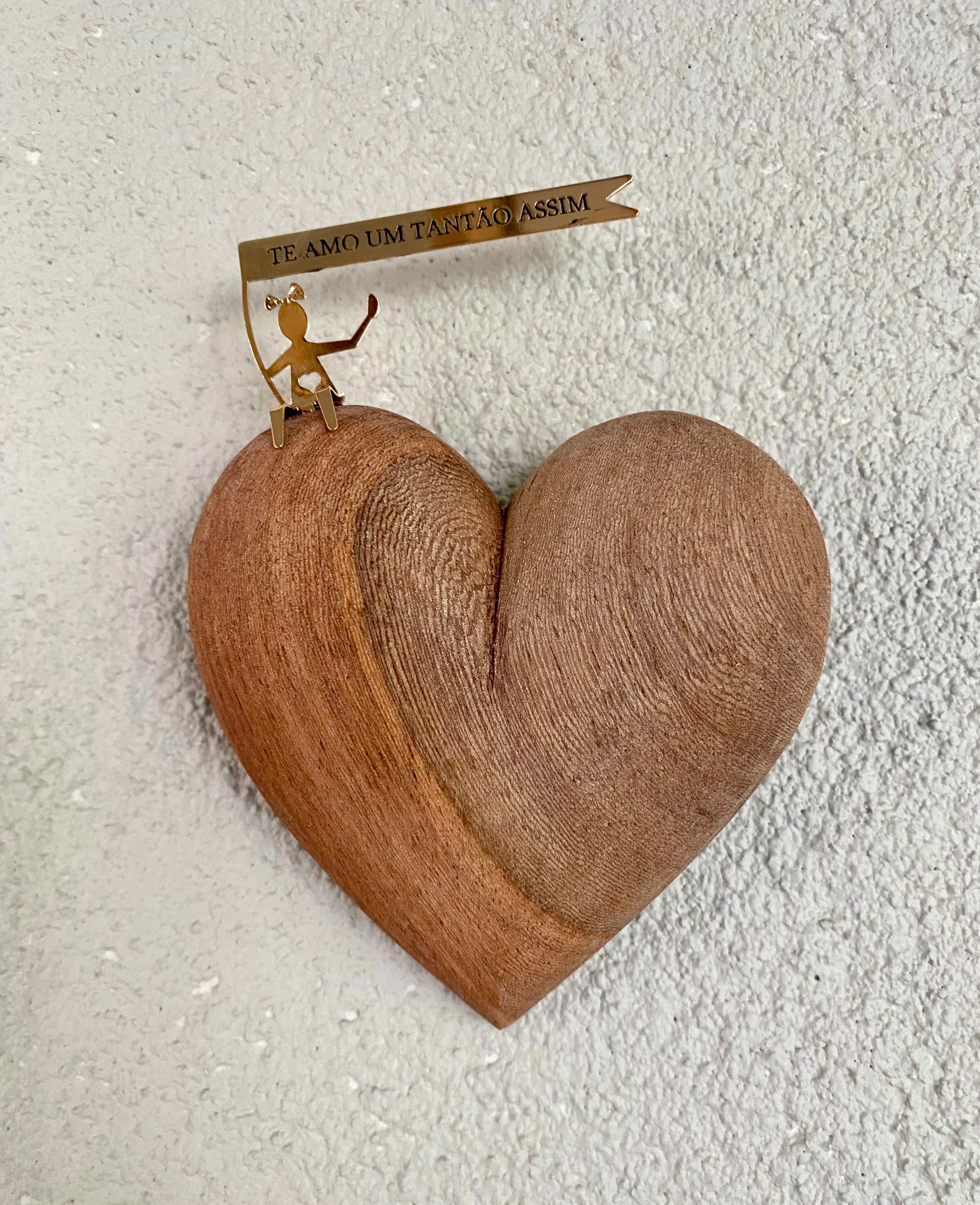 A peça é composta por um coração em madeira, que confere um toque de calidez e aconchego ao ambiente. Sobre ele, sentada, a charmosa personagem Esterzinha, feita em metal com banho dourado, segurando a placa "TE AMO UM TANTÃO ASSIM", também em metal com banho dourado, criando um contraste sofisticado com o coração de madeira.