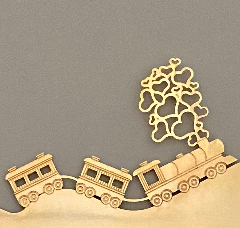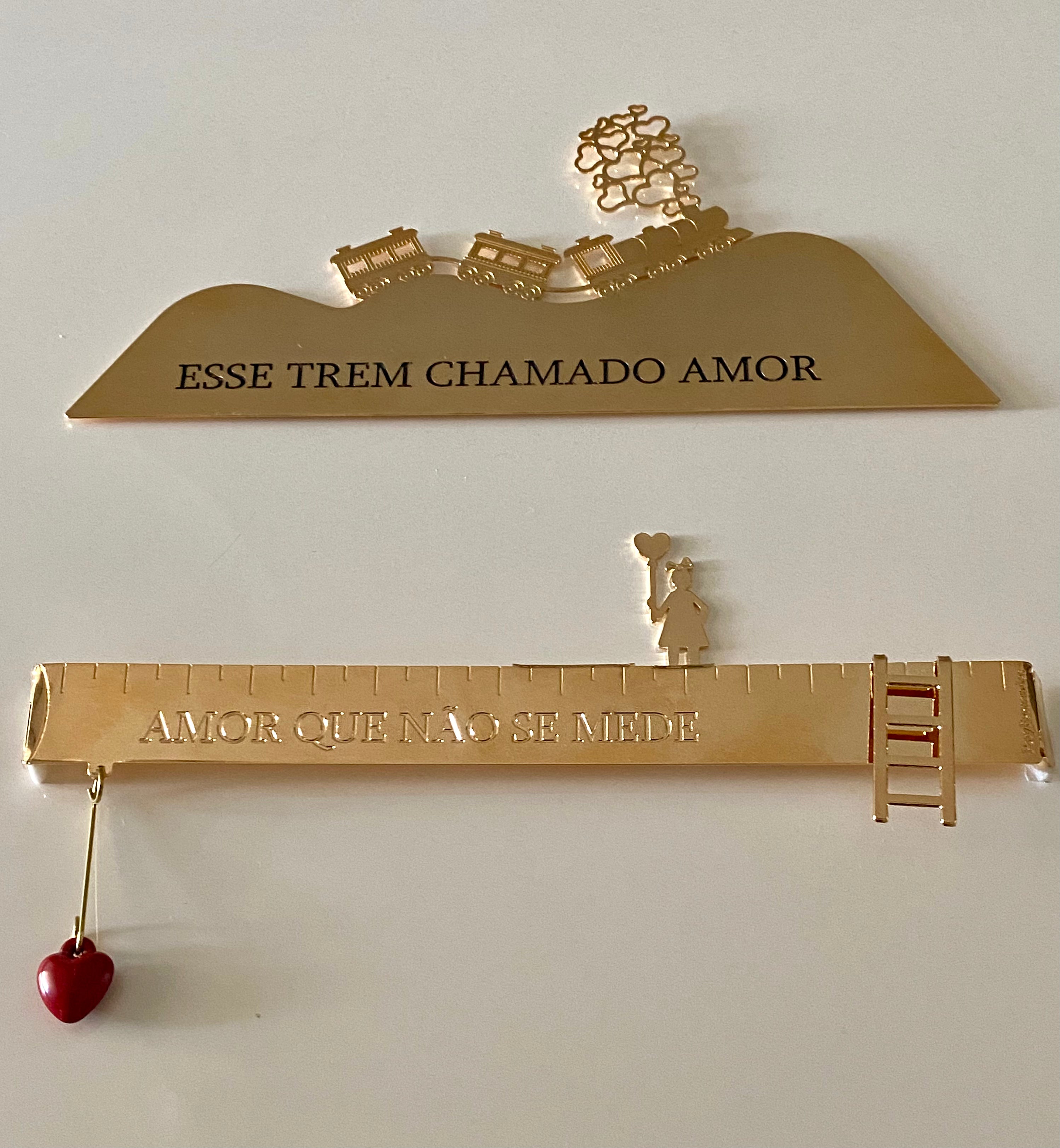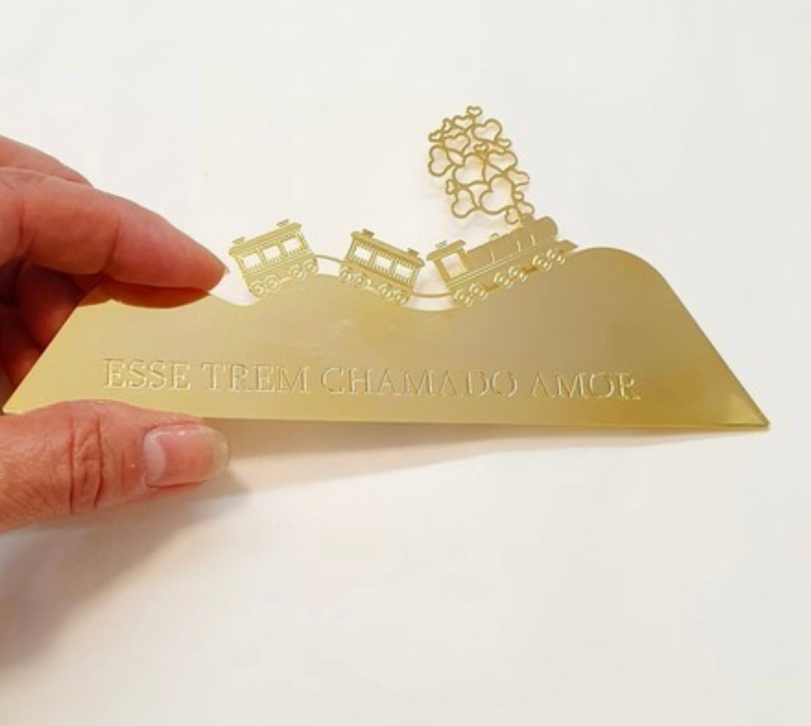 A frase "Esse trem chamado amor" está escrita na sequência montanhosa, enquanto a fumaça do trem se transforma em corações vazados, reforçando que o motor de tudo é o afeto. O acabamento em metal dourado banhado a ouro 18k torna a peça um destaque de decoração contemporânea e emocional. Perfeita para salas, quartos ou como um presente inesquecível que celebra noivados, casamentos e aniversários. Uma obra que transforma a decoração em um lembrete poético de que o destino mais valioso é a viagem ao lado de quem se ama.