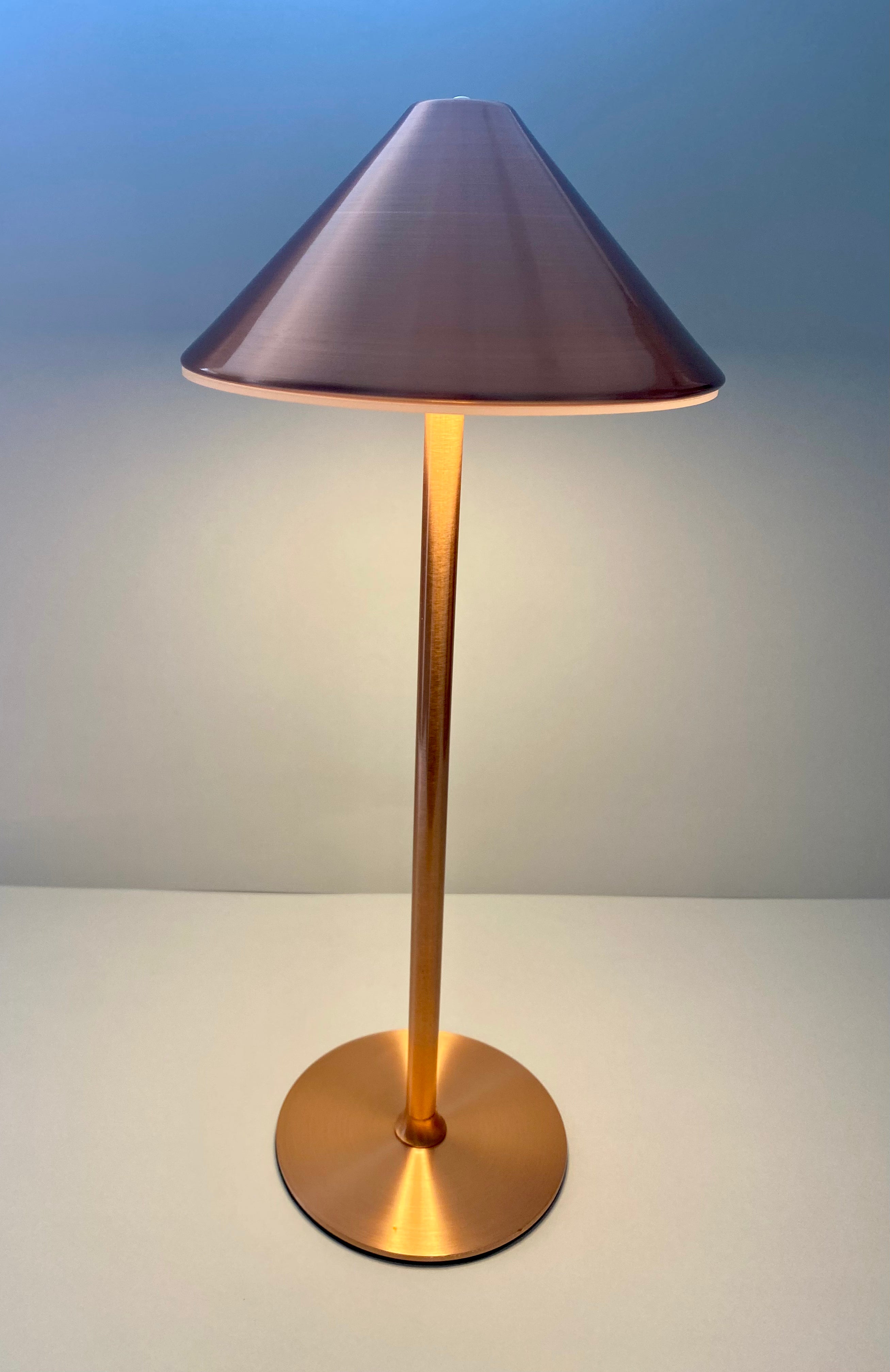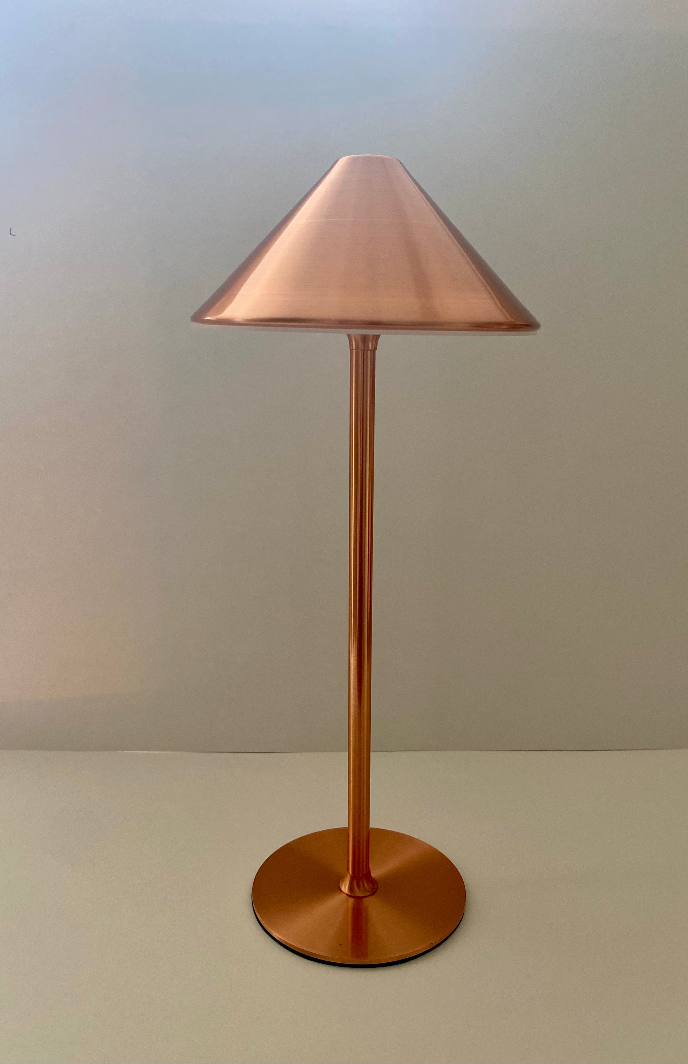 Elegante, a luminária Cone combina design e funcionalidade, oferecendo uma iluminação suave e acolhedora. É acionada pelo toque, tem regulagem de cor e de intensidade da luz e tem bateria recarregável.