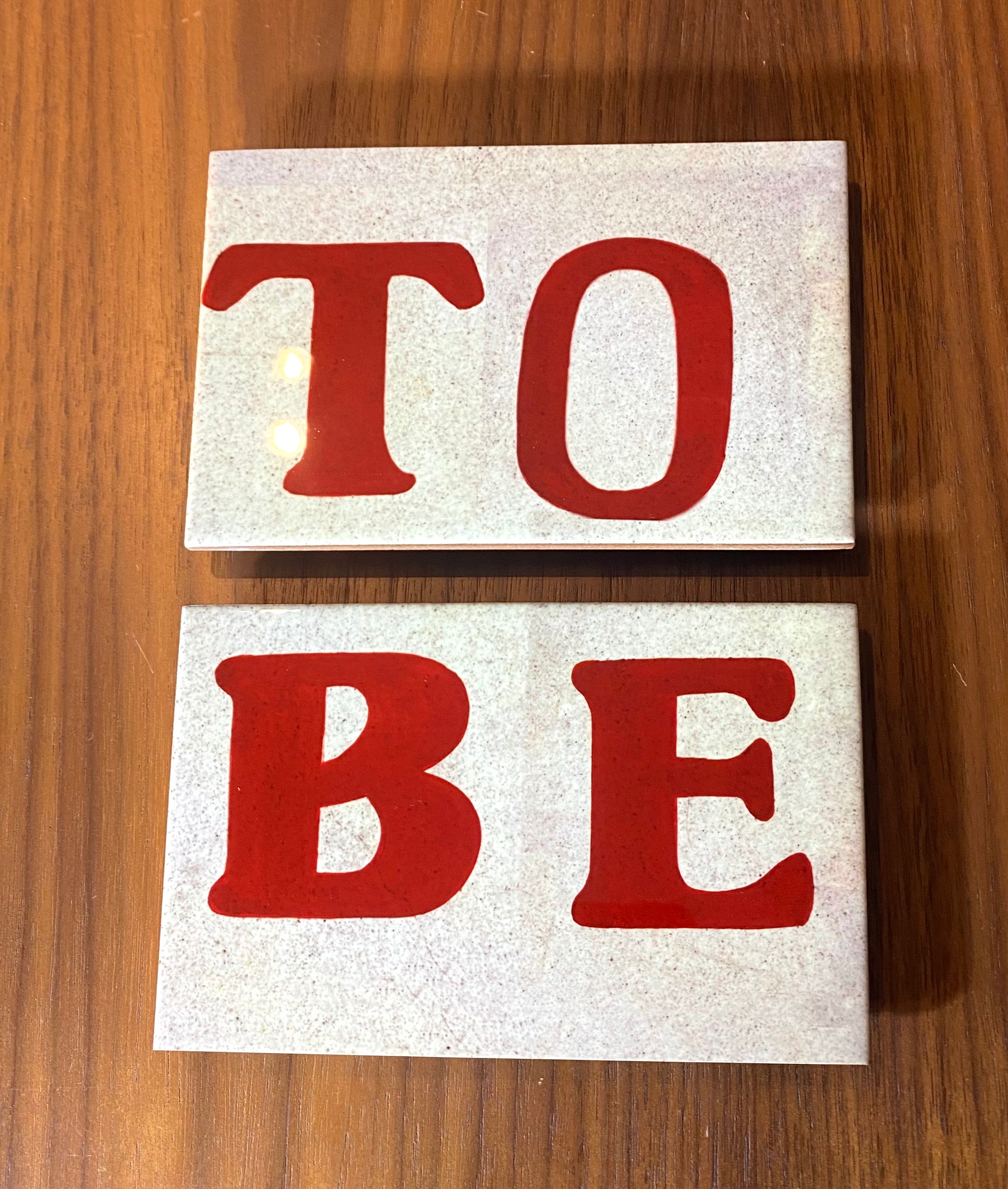 Conjunto decorativo de parede, formado por 2 azulejos estampados trazendo a expressão TO BE em vermelho. Simples assim: SER! Fica lindo enfeitando um cantinho da sala, um hall de entrada, um lavabo ou em composição com outros objetos ou quadros. Perfeito para apresentar.