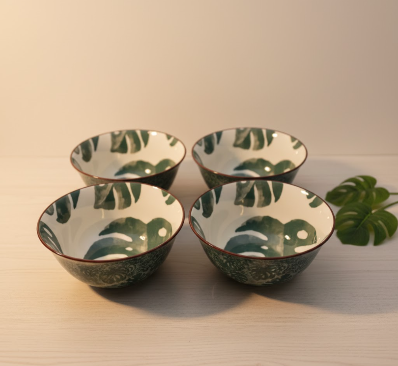 Kit 4 Bowls Cerâmica Estampa Botânica – Conjunto Para Mesa Posta