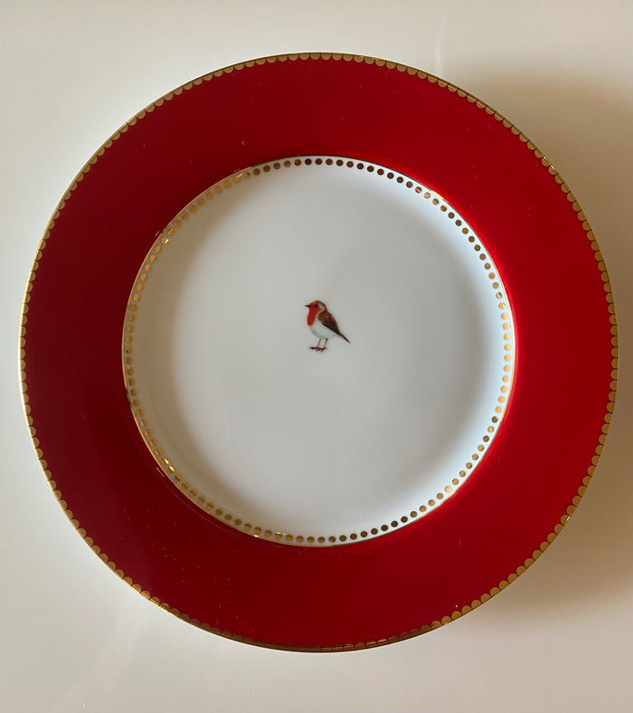 O prato de sobremesa da coleção Love Birds tem o fundo branco com um lindo pássaro ao centro. A borda é vermelha com fio de ouro. Tem mais bonito?