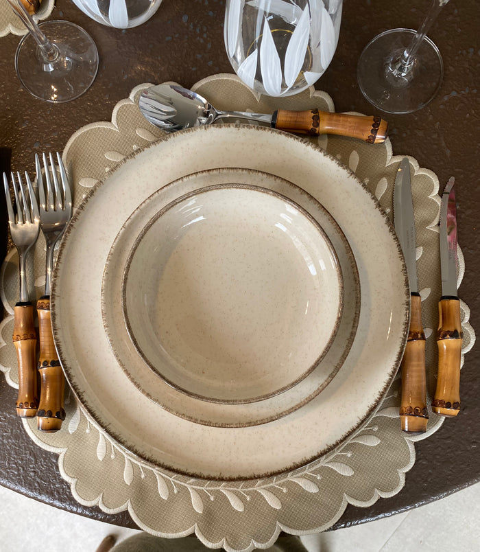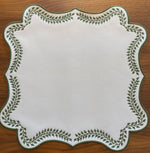 Sofisticado, o jogo americano na cor caqui tem a borda recortada e a elegante guirlanda bordadas em off white. É perfeito para transformar suas refeições em momentos especiais.