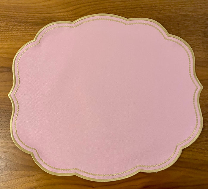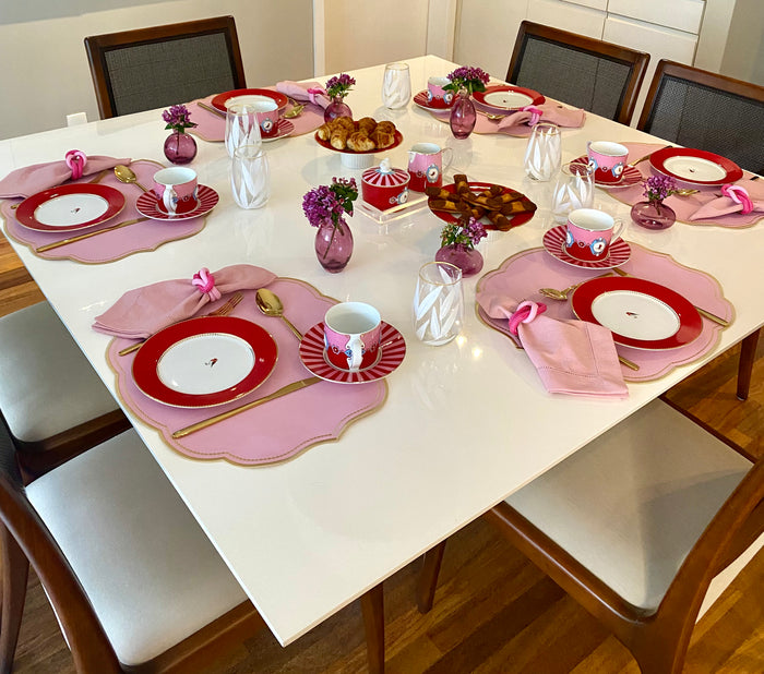 Delicado, o jogo americano na cor rosa ganha a sofisticação do bordado dourado. Usado com um conjunto de talheres dourados, vai agregar ainda mais beleza à sua mesa posta.