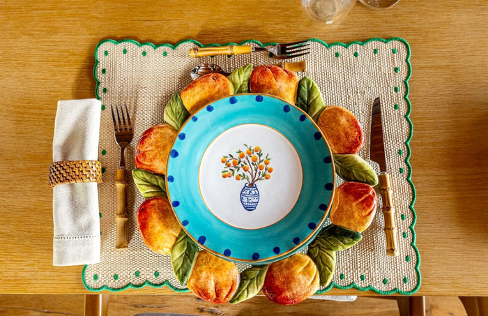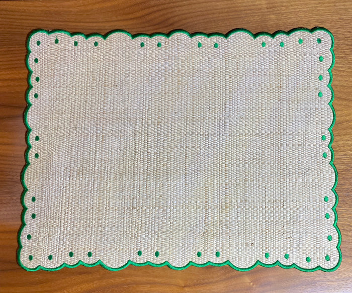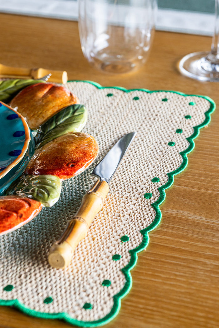 Em formato retangular, o jogo americano de palha é bordado em verde. Dá um toque de rusticidade elegante à mesa posta.