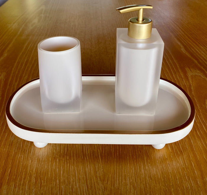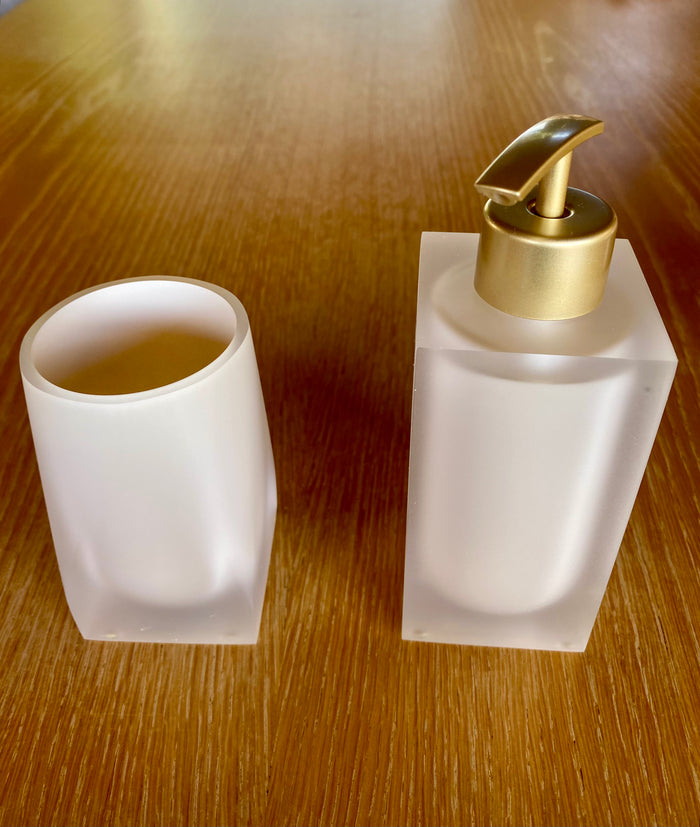 Conjunto que trará elegância e sofisticação ao seu lavabo ou banheiro, tem o porta-sabonete líquido produzido em poliresina, com efeito frosty, e válvula pump metalizada na cor dourado fosco. O...