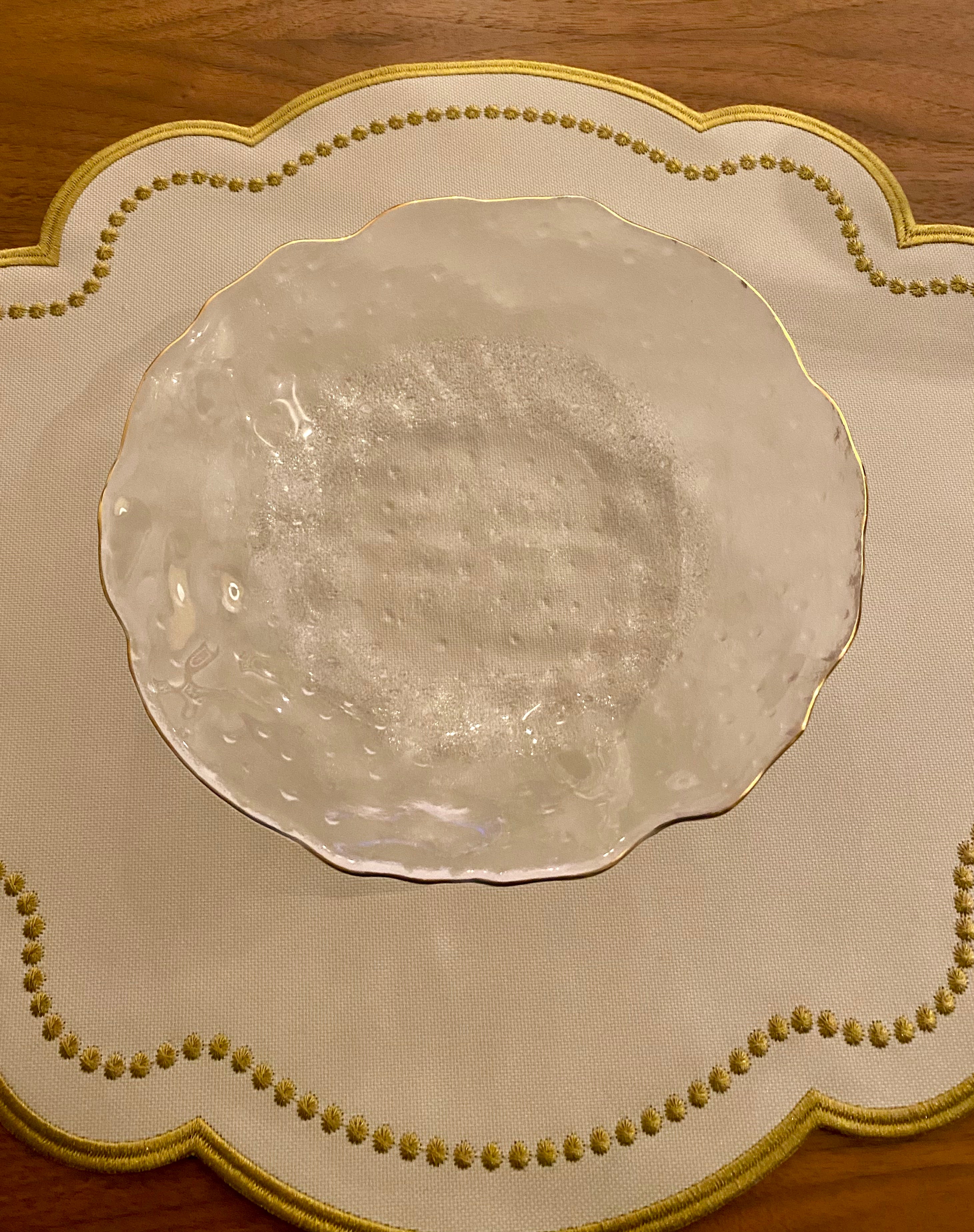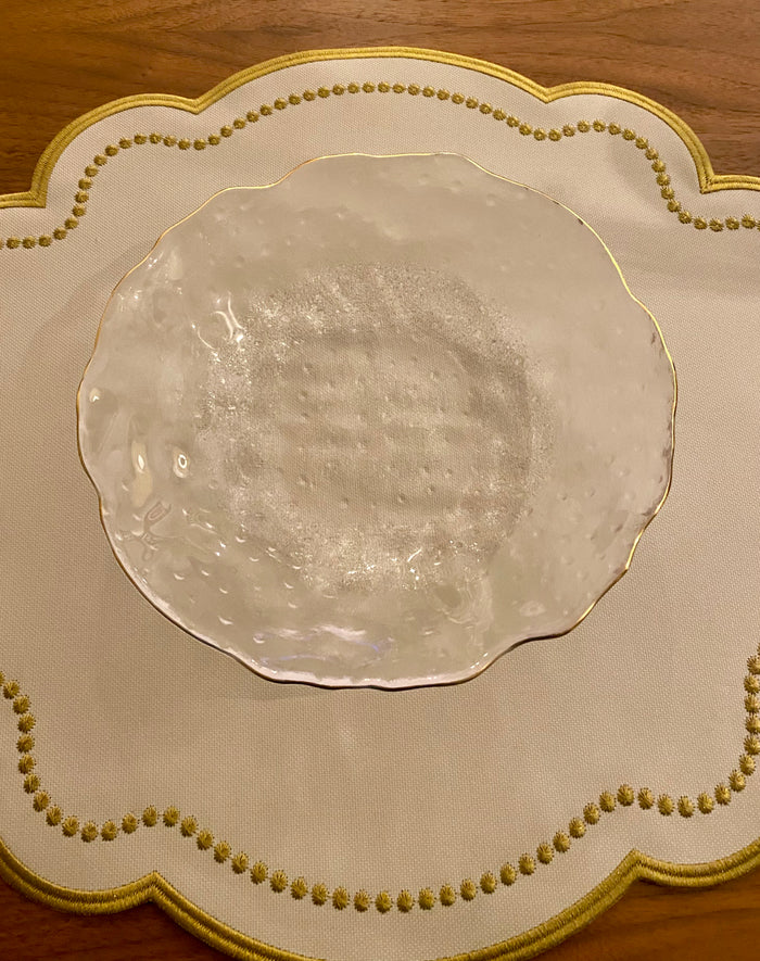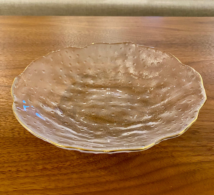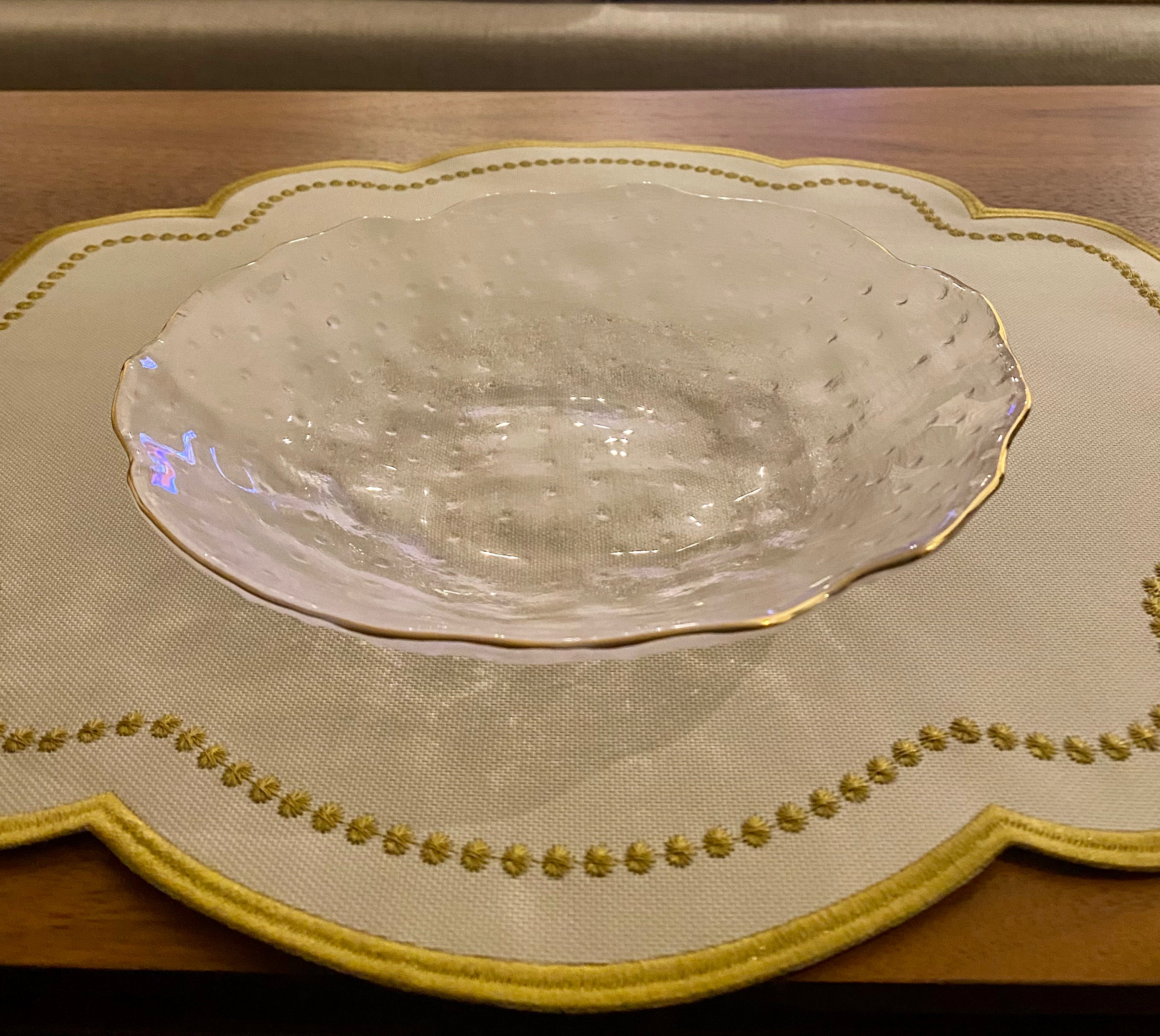 Eis as peças que faltavam para dar um toque especialíssimo à sua mesa. Os pratos fundos de vidro martelado com bordas onduladas e filetes dourados combinam a delicadeza do acabamento artesanal com a beleza atemporal dos filetes dourados, criando peças únicas e sofisticadas. São pratos de vidro com design moderno que elevarão a categoria de seu evento, seja um jantar em família ou uma ocasião mais formal.