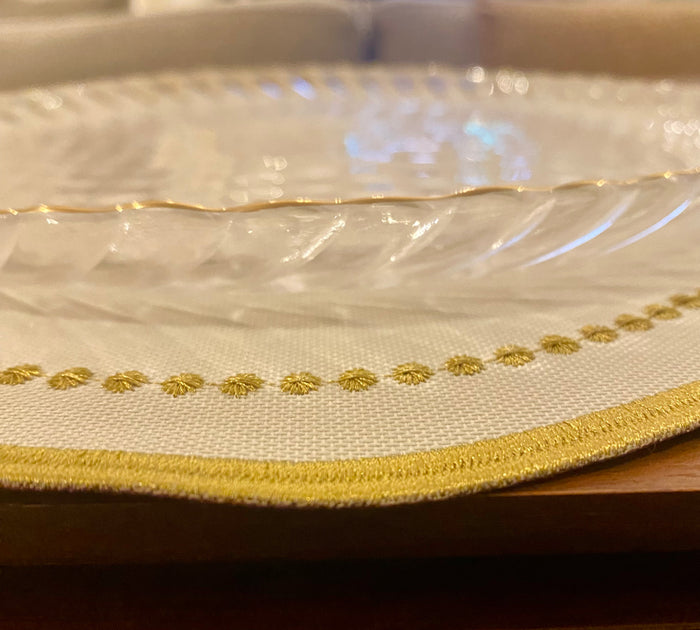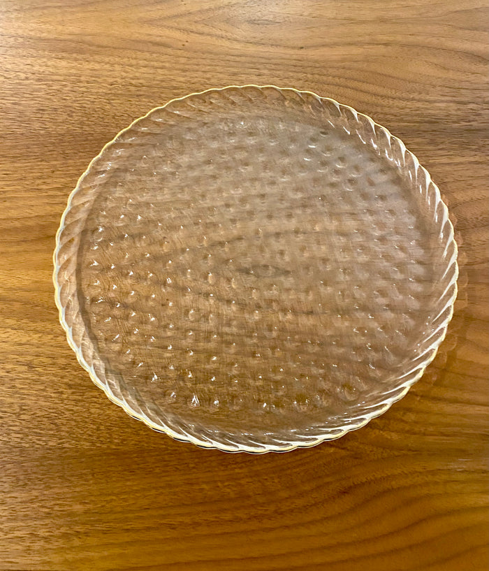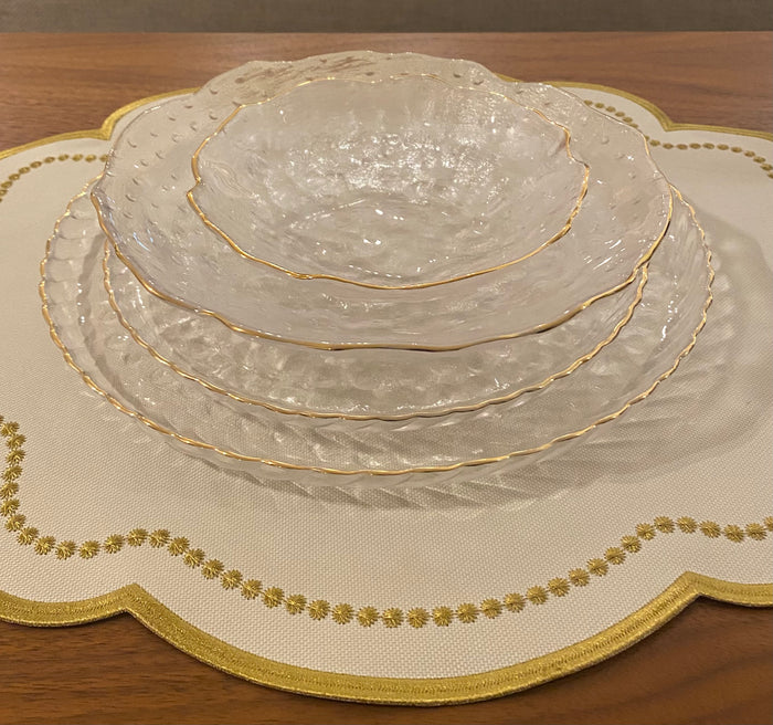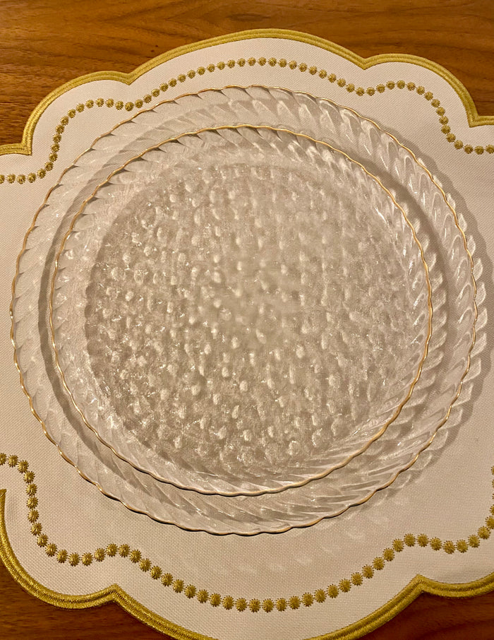 KIT 4 PRATOS RASOS DE VIDRO MARTELADO E BORDAS DOURADAS