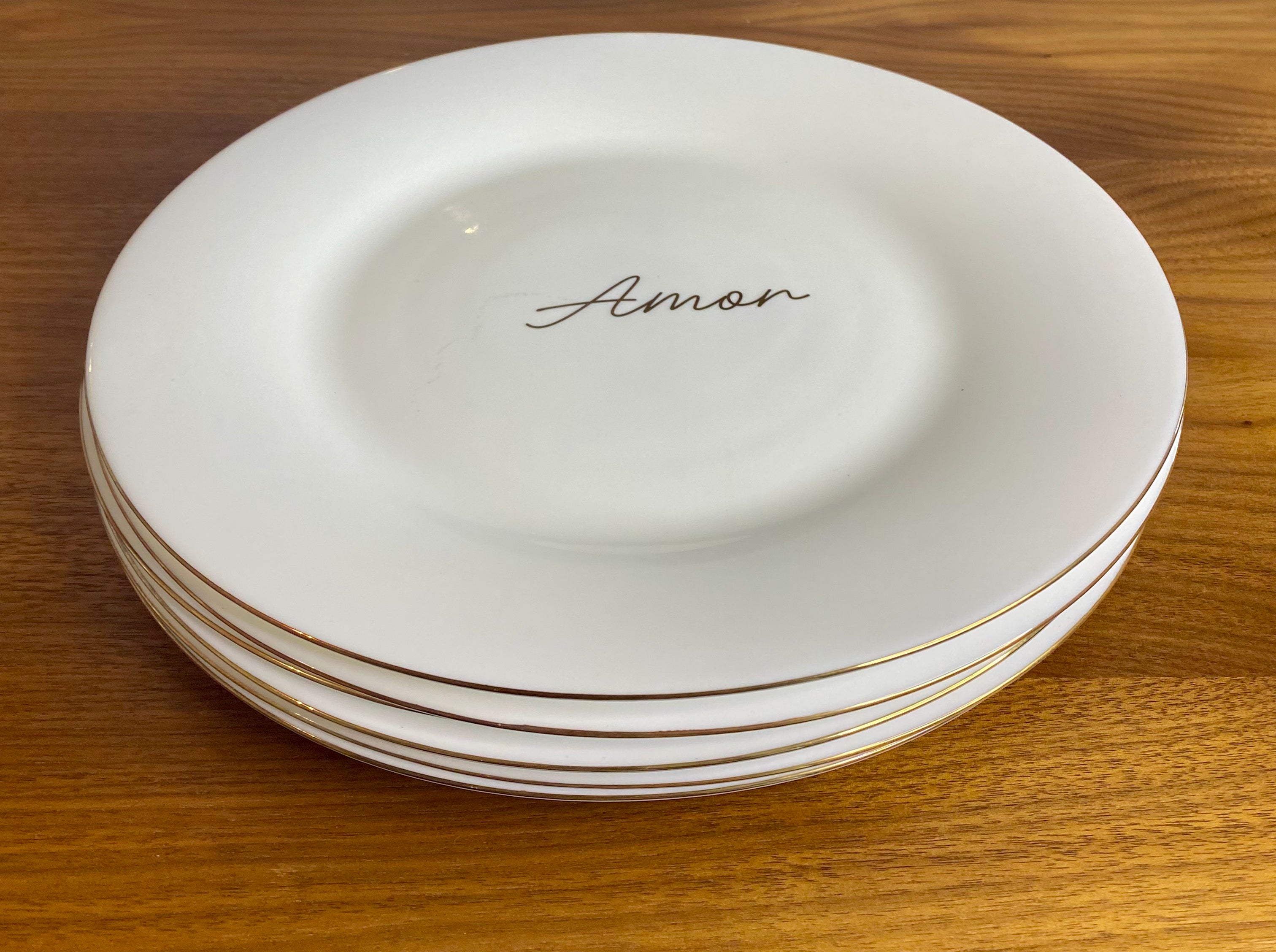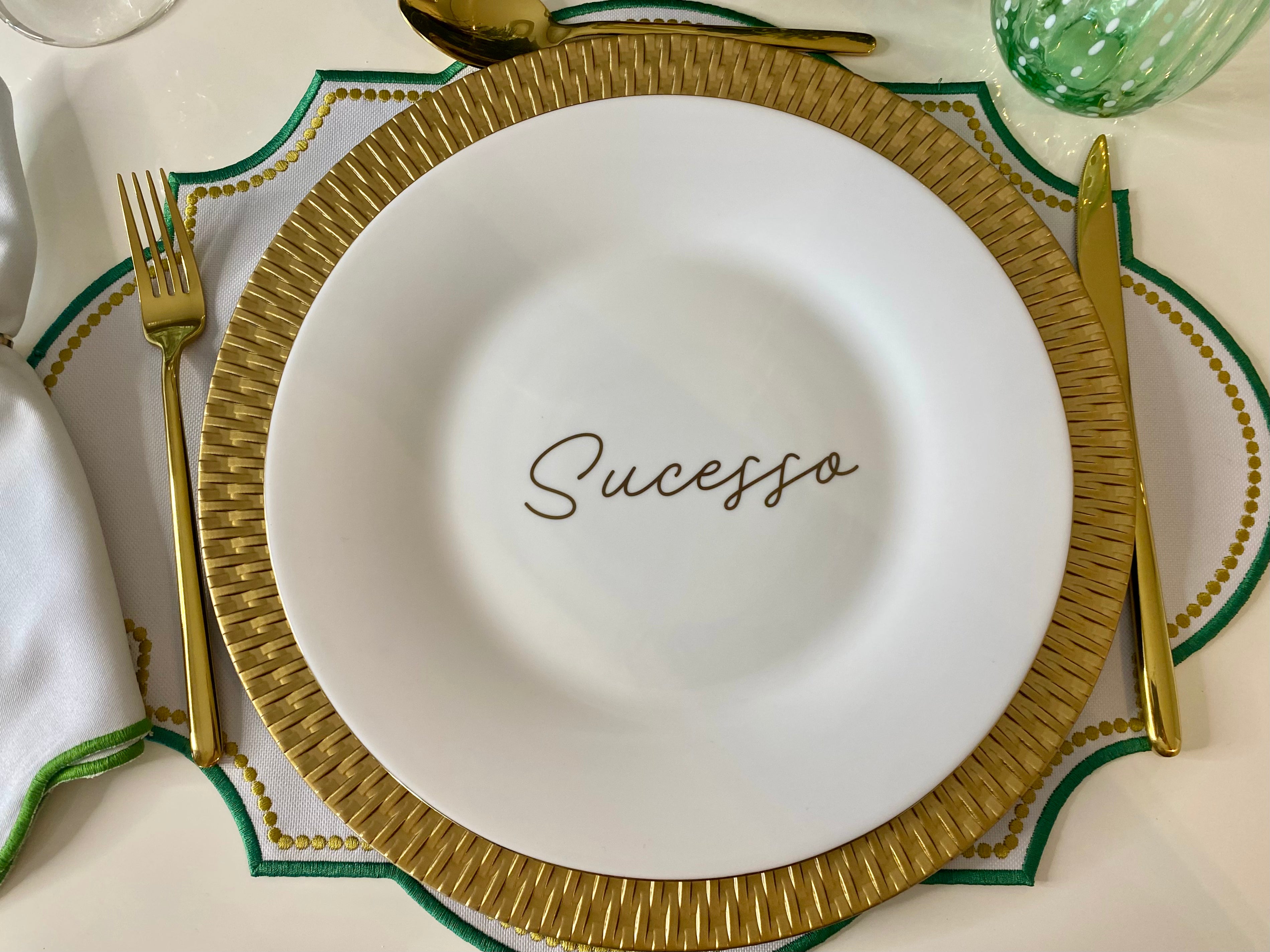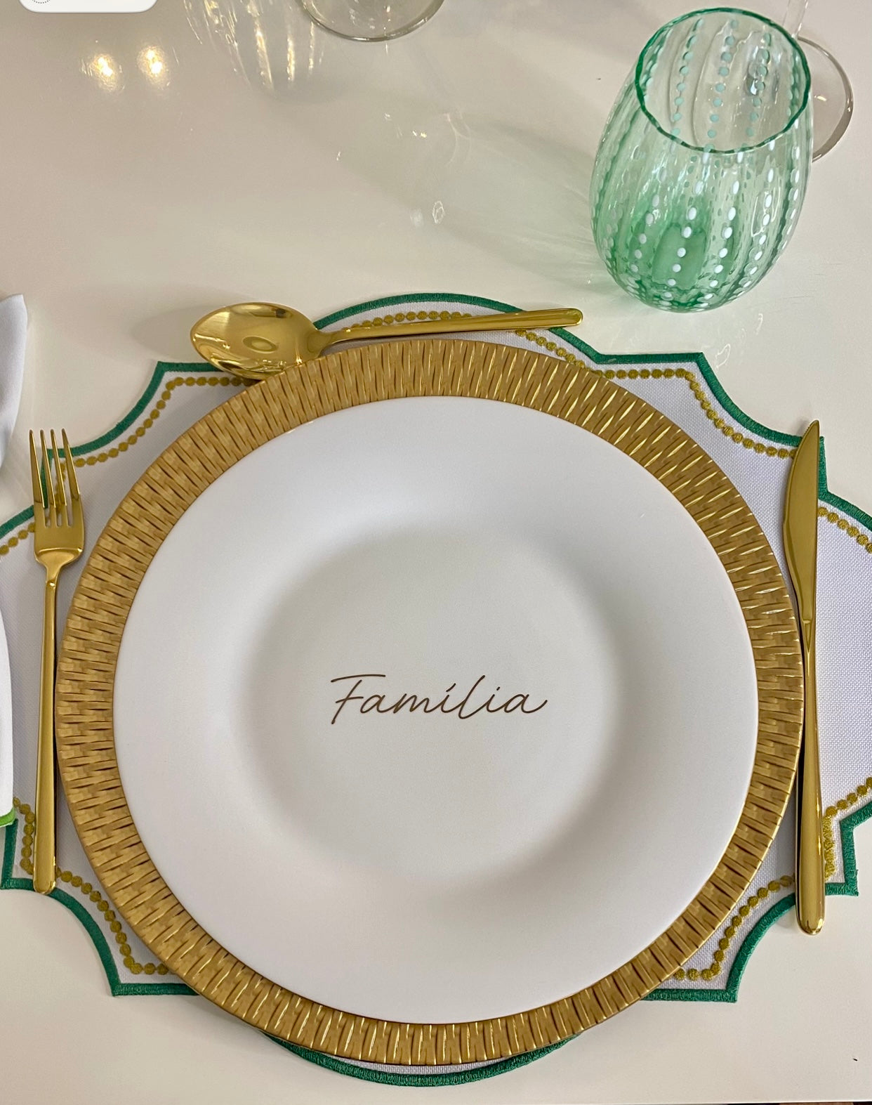 KIT 6 PRATOS RASOS DE VIDRO OPALINO LINHA DESEJOS BRANCO COM DOURADO