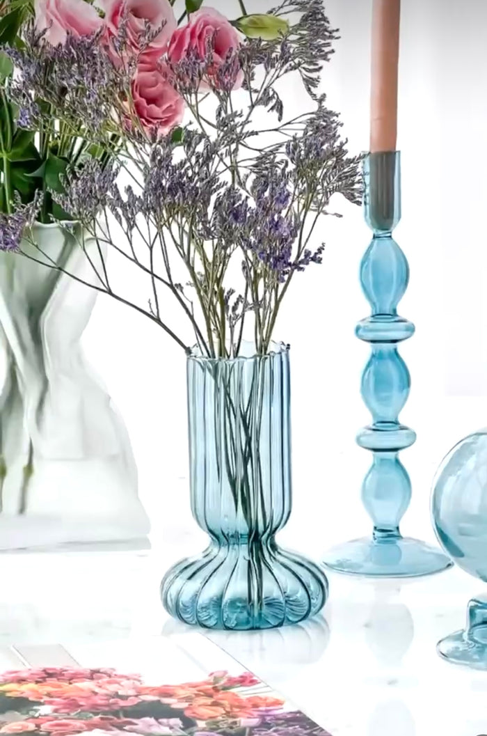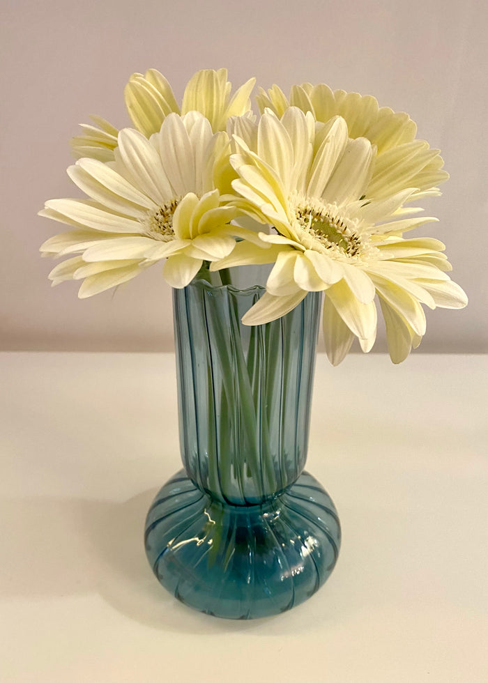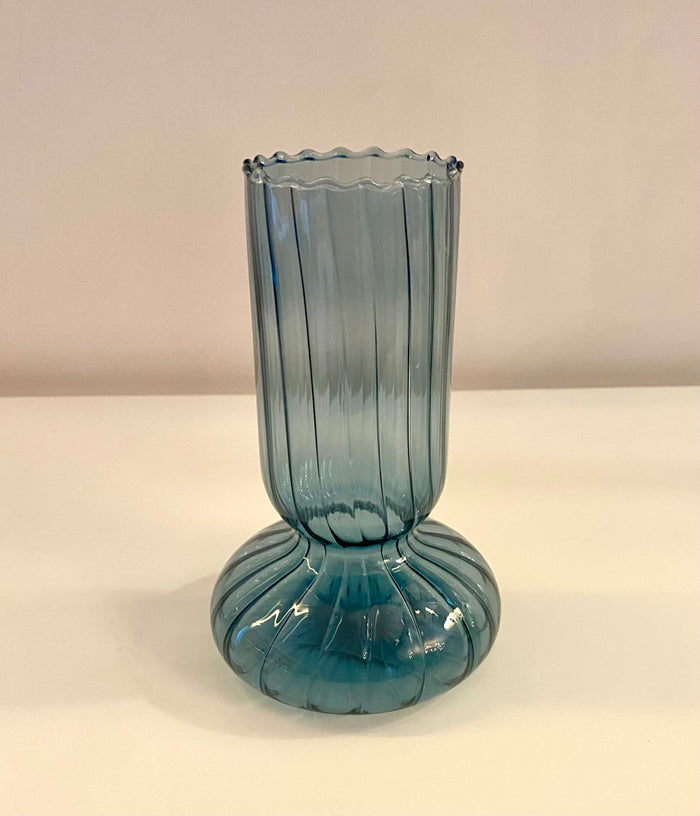 MINI VASO DE VIDRO CANELADO BASE BOJUDA, AZUL