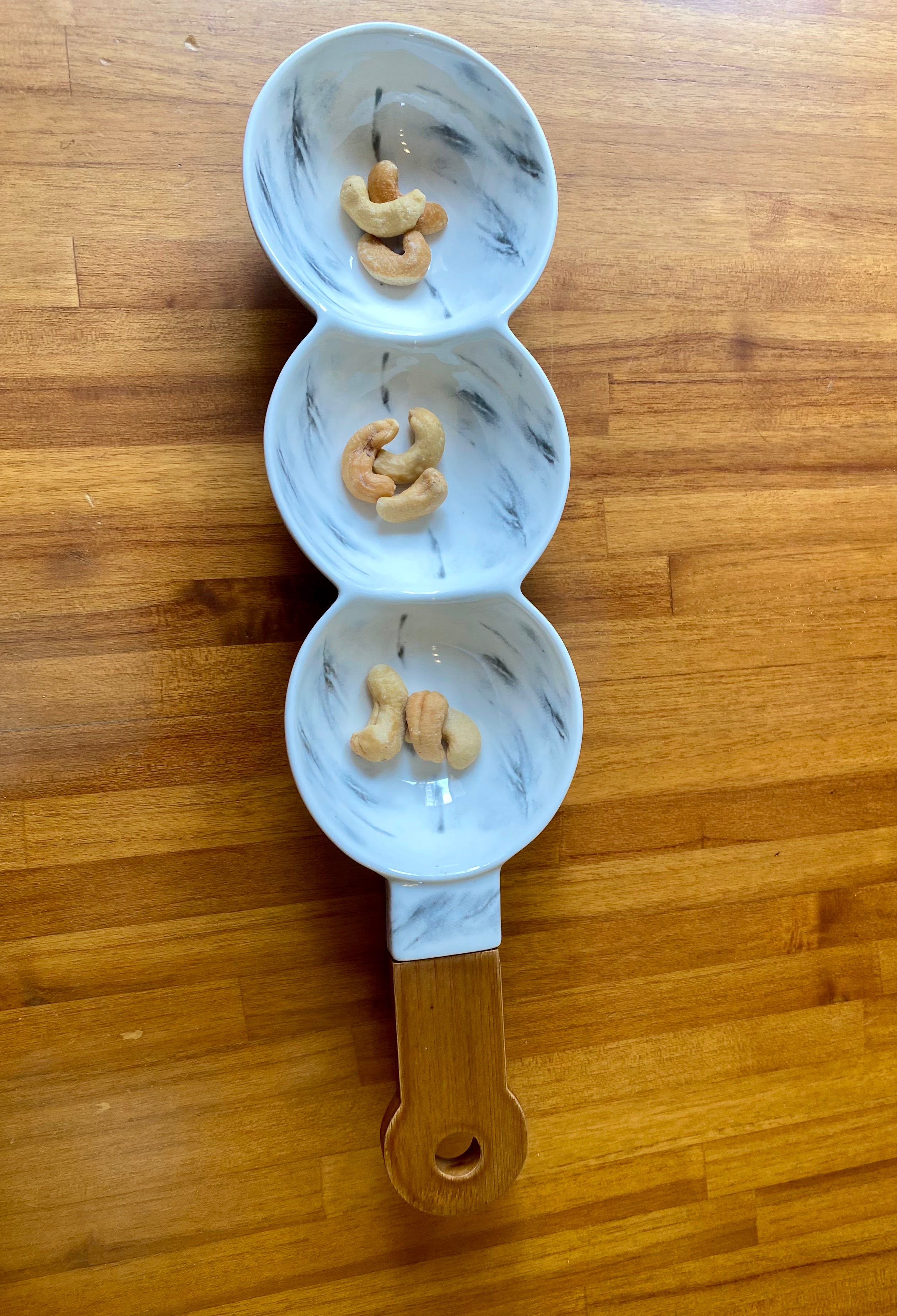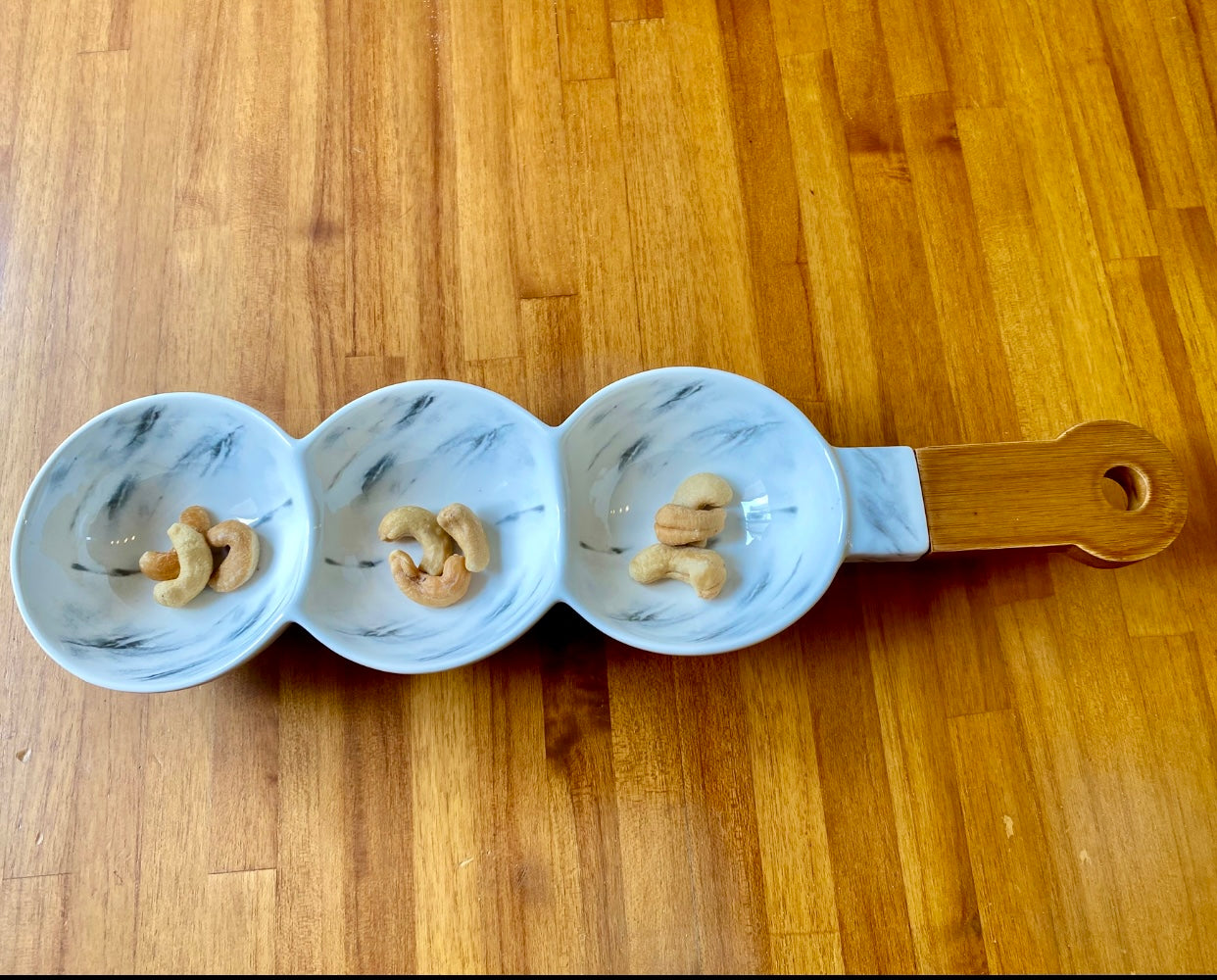 Petisqueira em cerâmica marmorizada com cabo em madeira. Ideal para presentear, petisqueira com cabo em madeira e cerâmica marmorizada com 3 bowls interligados. Em formato não convencional, a petisqueira em...