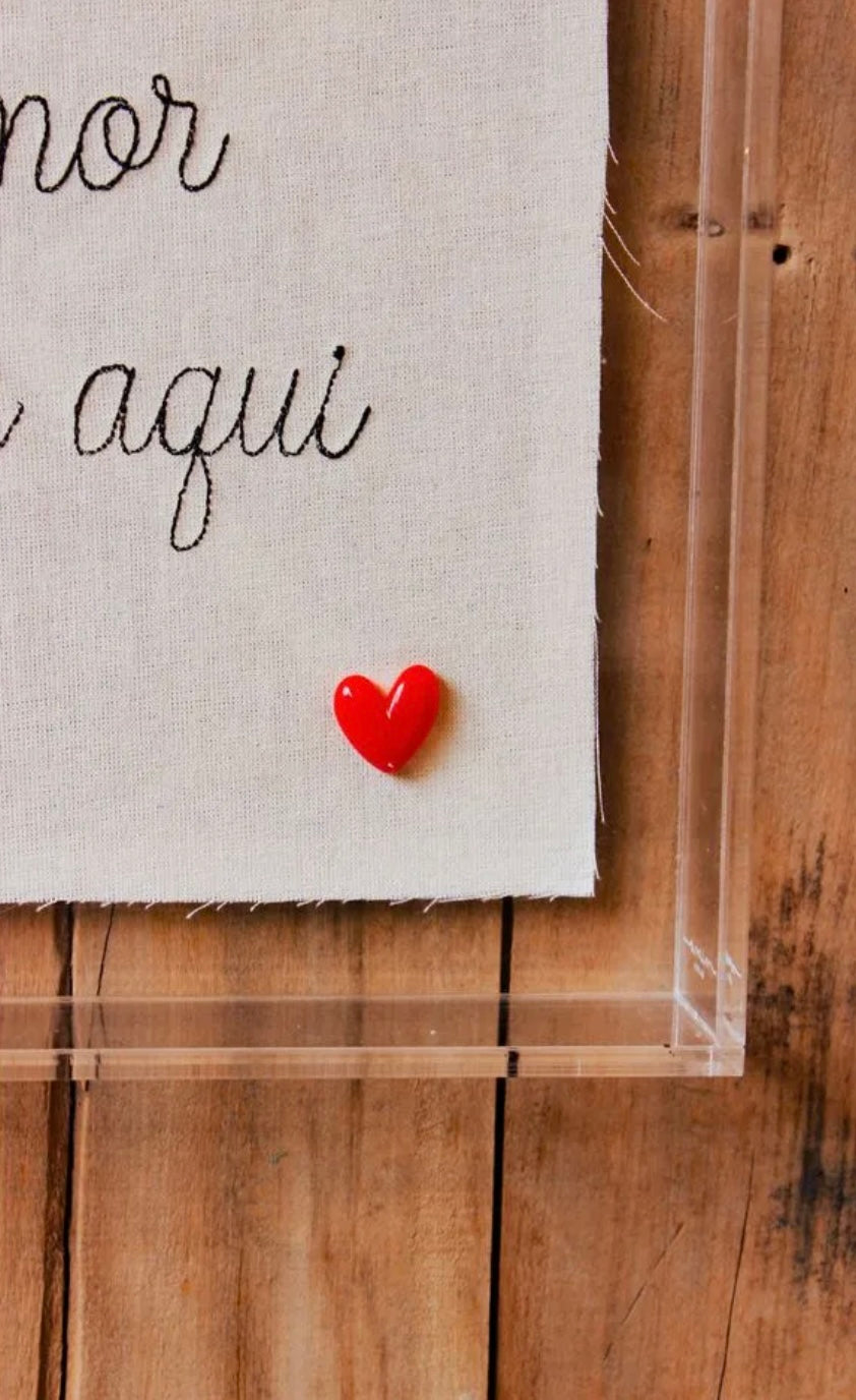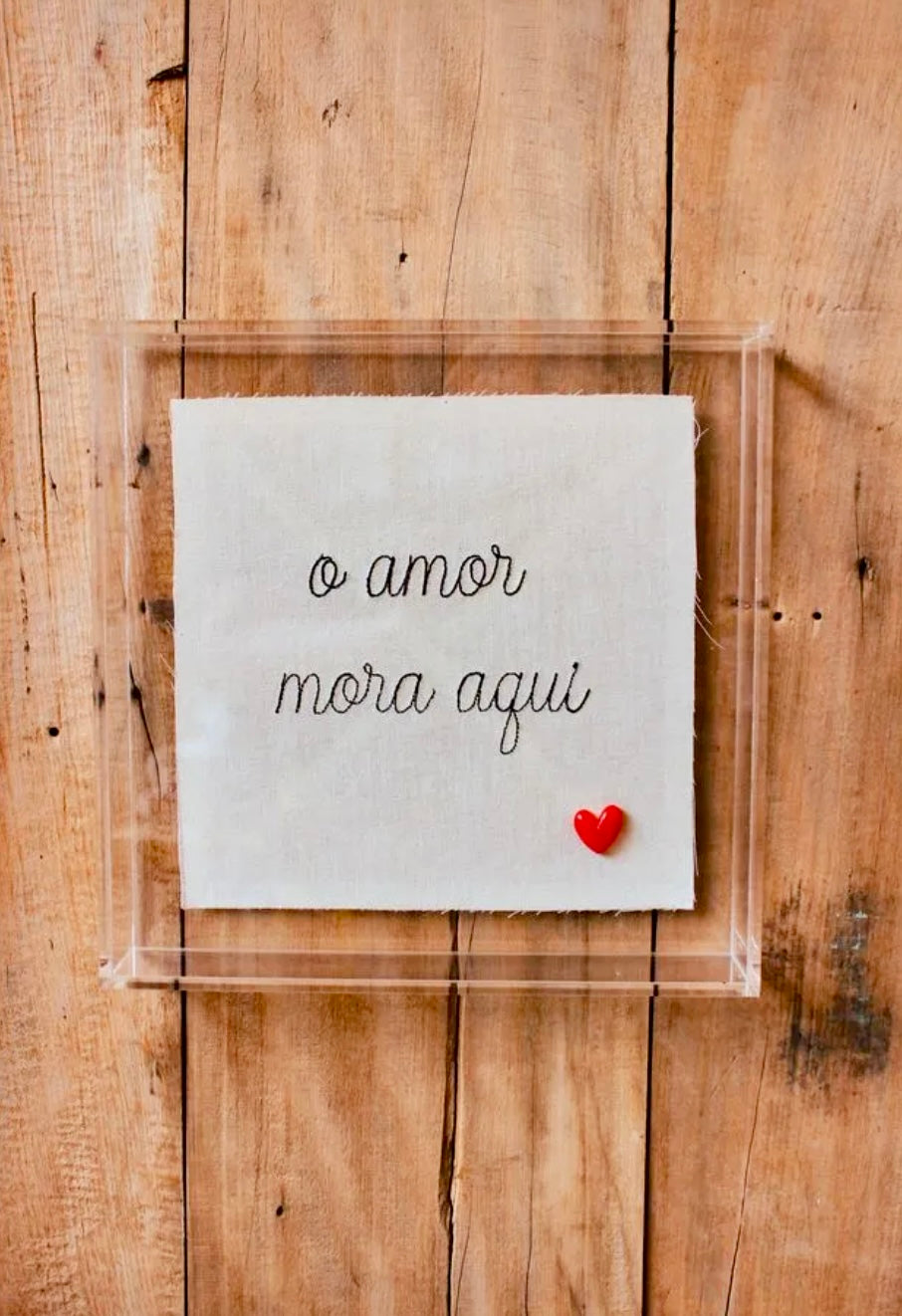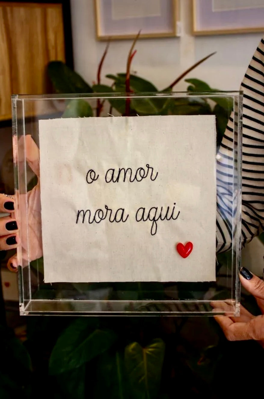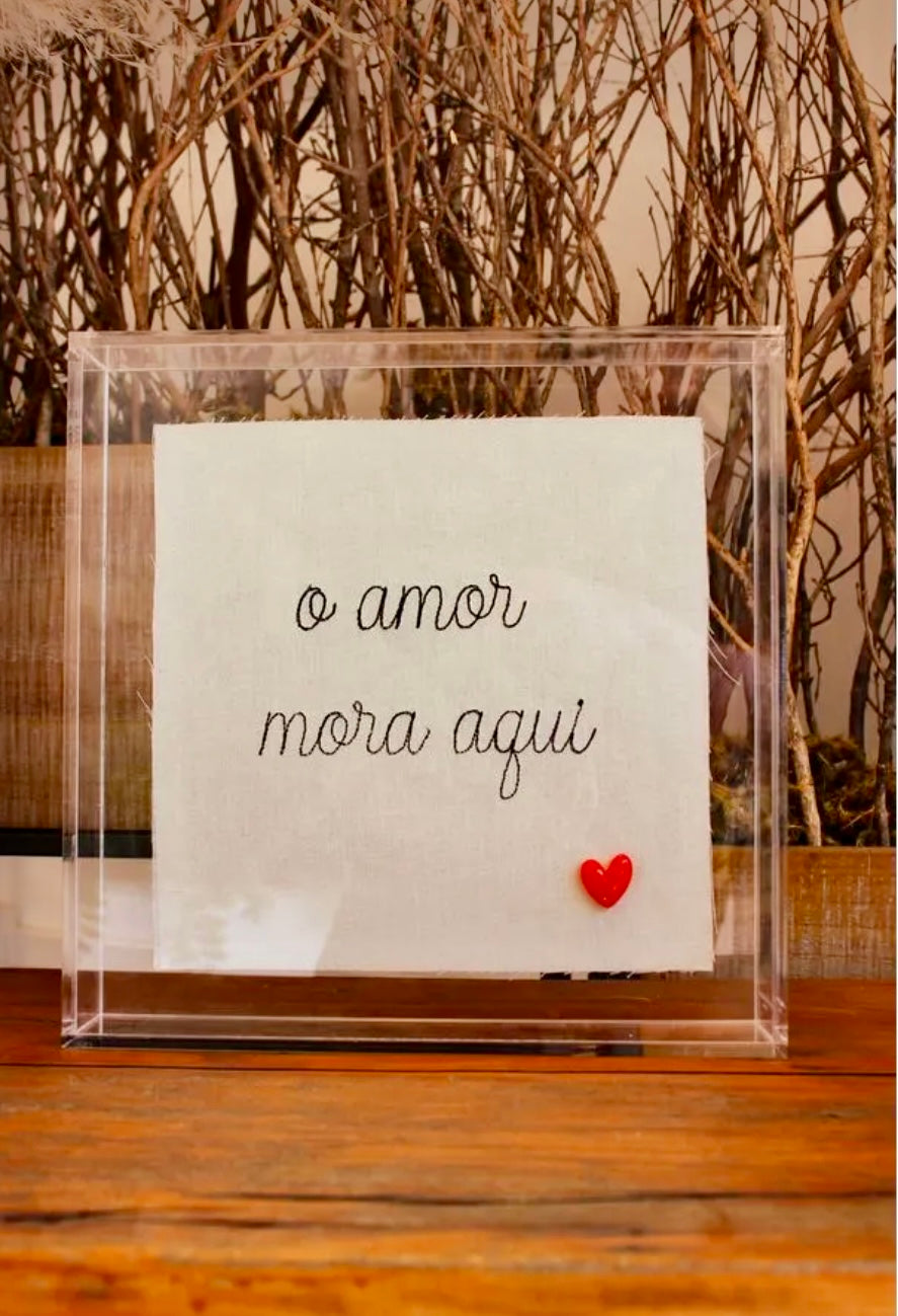 QUADRO DE ACRILICO COM BORDADO "O AMOR MORA AQUI"