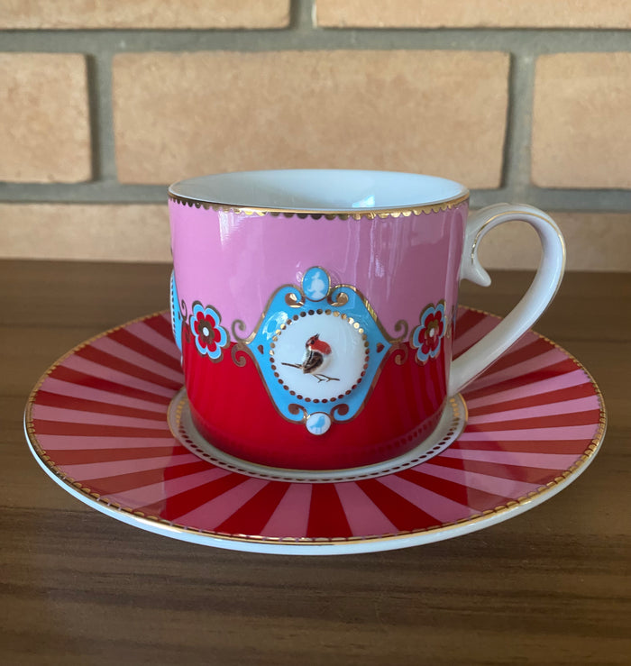 O set de xícara com pires listrado, vermelho e rosa, é fabricado pela Pip Studio, em porcelana de altíssima qualidade. O medalhão, o pássaro e outros elementos decorativos, com detalhes...